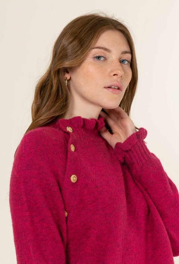 Pull à boutons dorés fantaisies ouvrables à l'épaule, Manches longues, col haut, volants sur le col et les poignets.