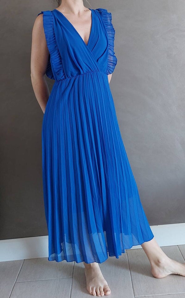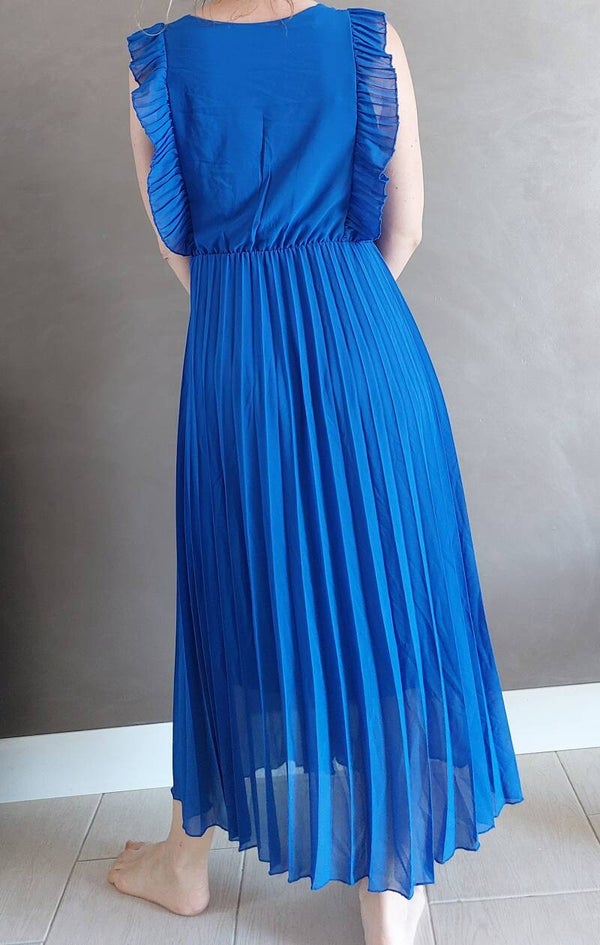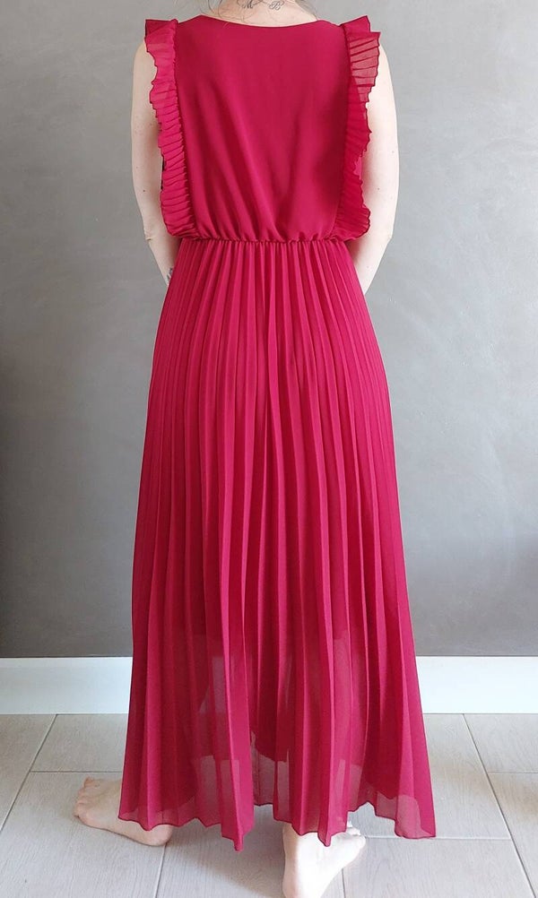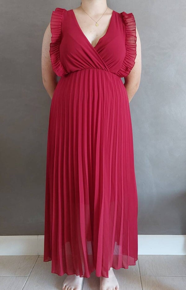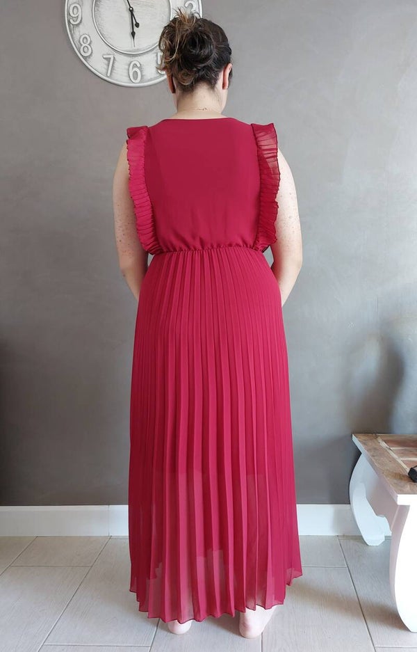 Robe longue plissée, doublée, volant sur les épaules, col cache coeur.