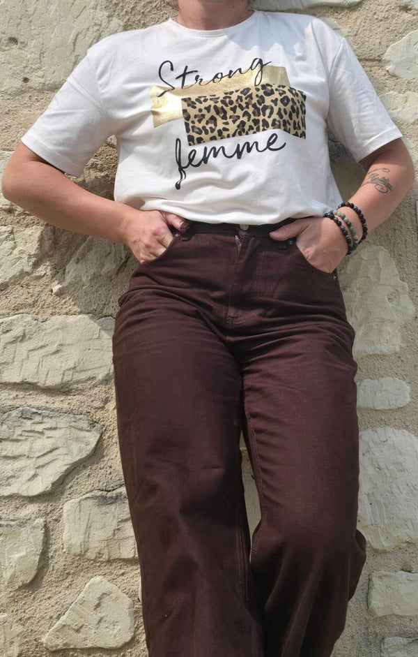 Jeans marron large, taille haute, long en jambe. Confortable à porter et belle coupe.