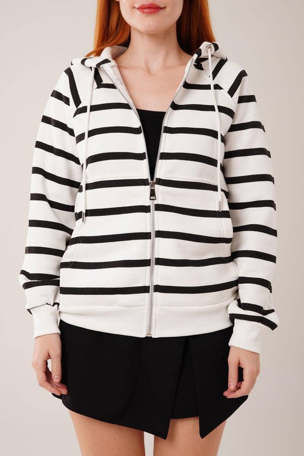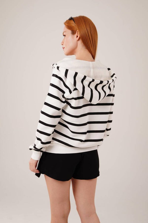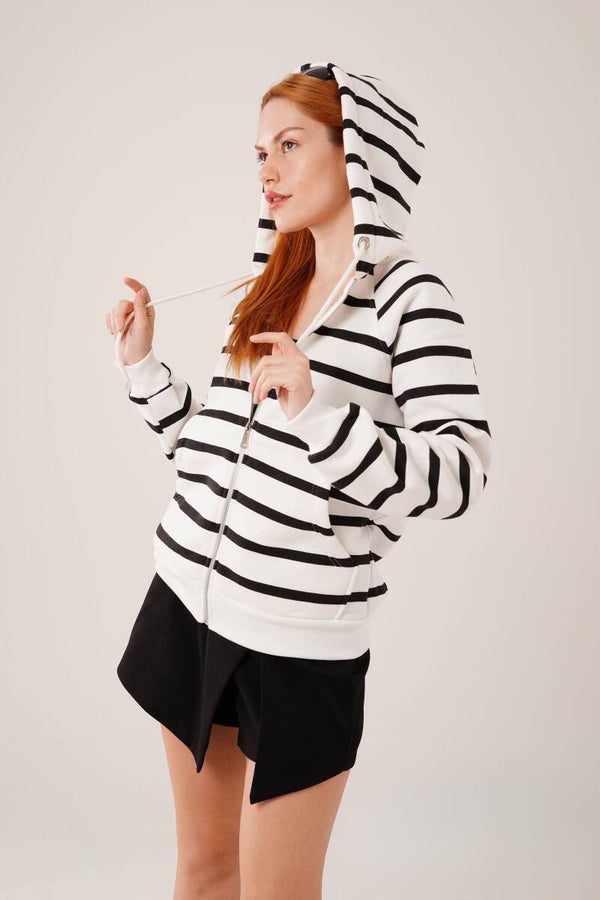 Veste à capuche rayée noir, intérieur doux et chaud.