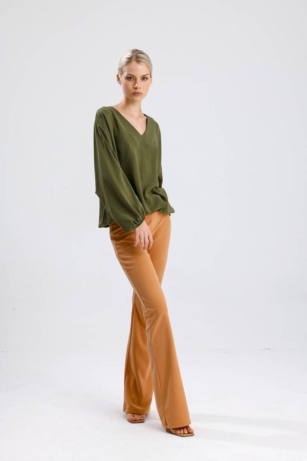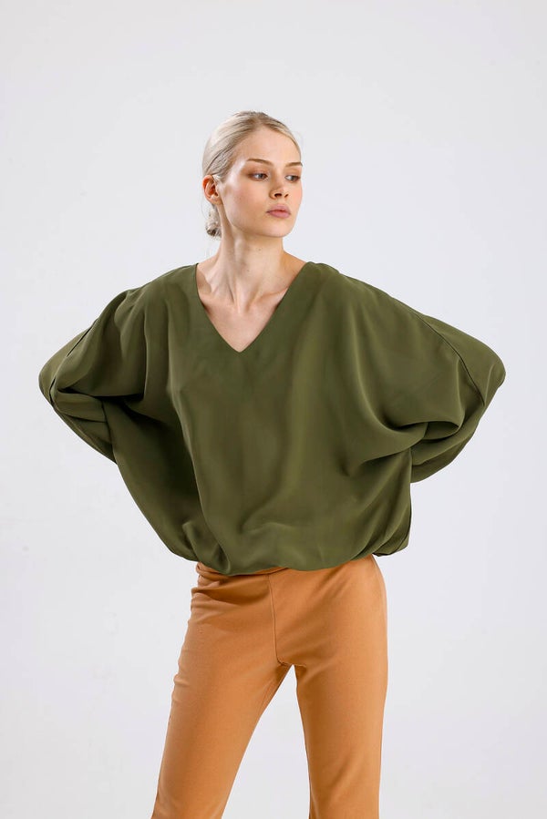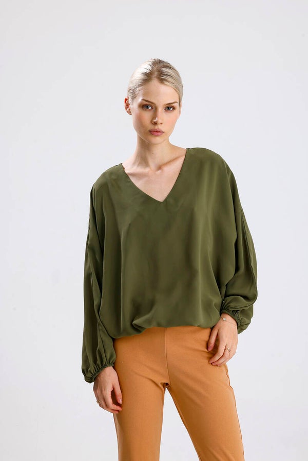 Blouse kaki souple, élastiquée à la taille, manches ballon élastiquées au poignet.