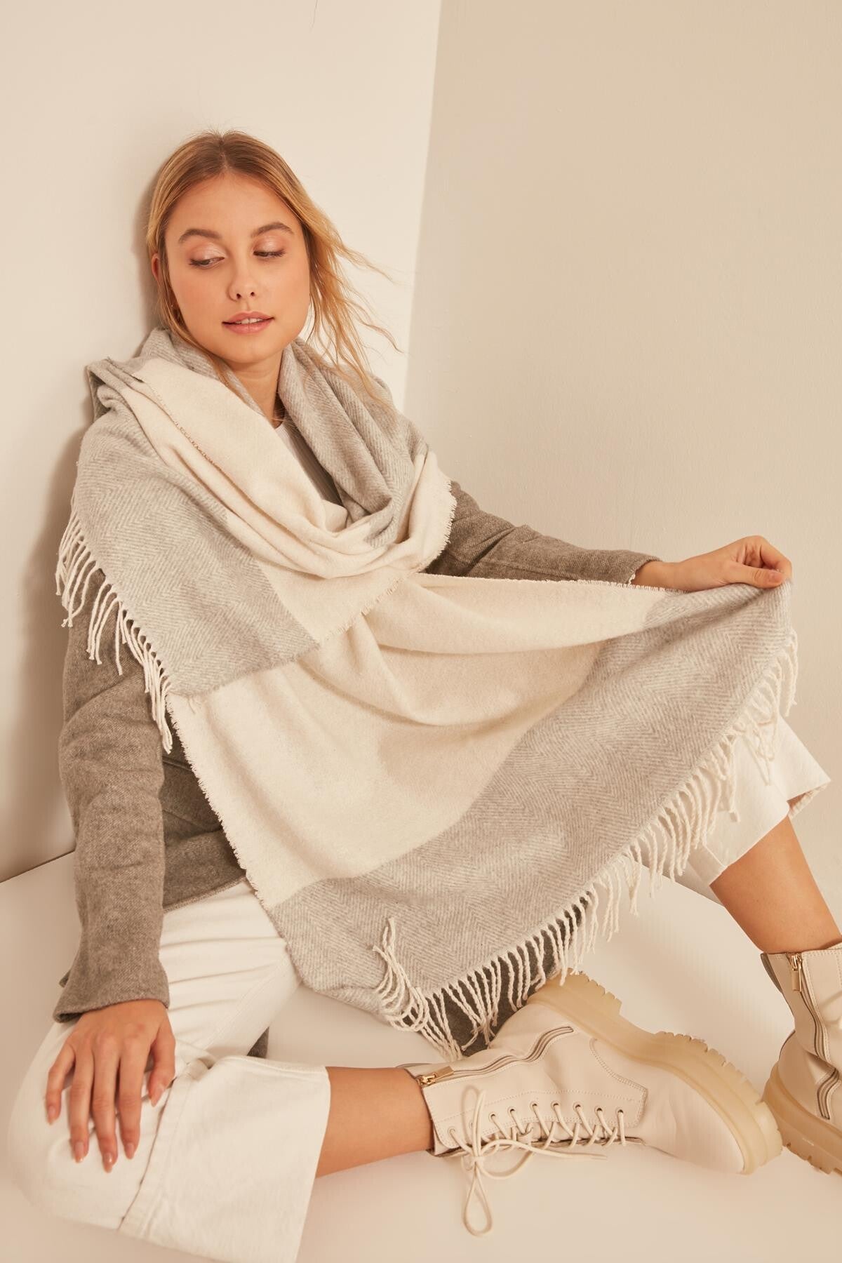 Écharpe beige/blanc à franges, 65x180.