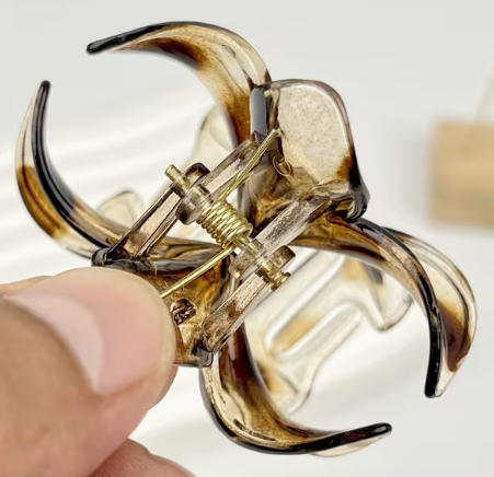 Pince crabe a cheveux "coeur ou fleur" avec motif léopard, avec tige métal et corps plastique.
