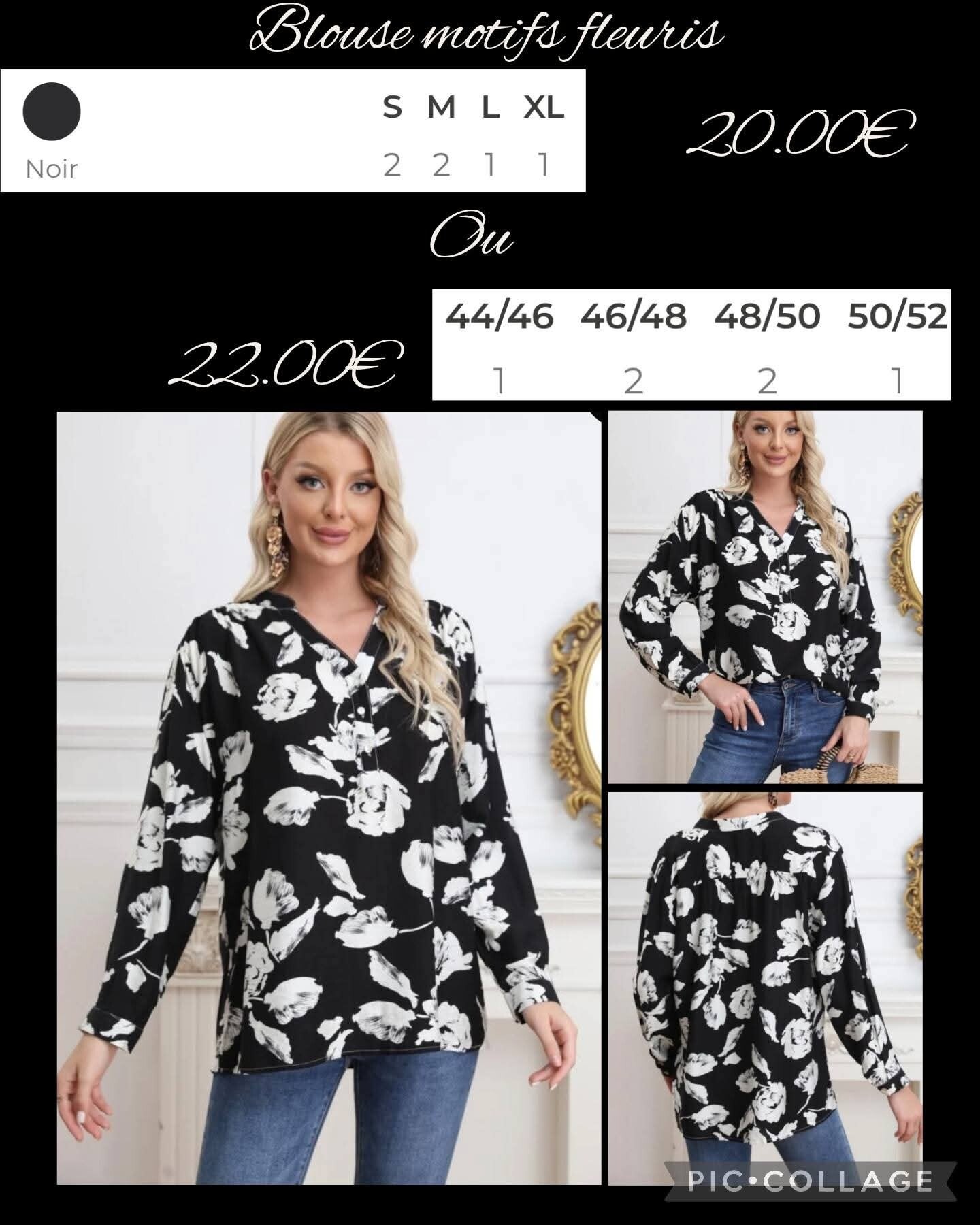 Tunique noire à motifs fleurs blanches, coupe plus longue arrondi derrière.