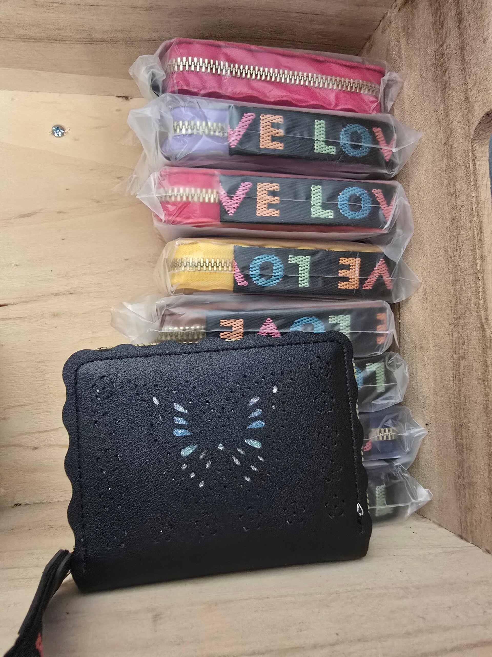 Porte-monnaie, motif papillon brillant en relief, sangle "Love".