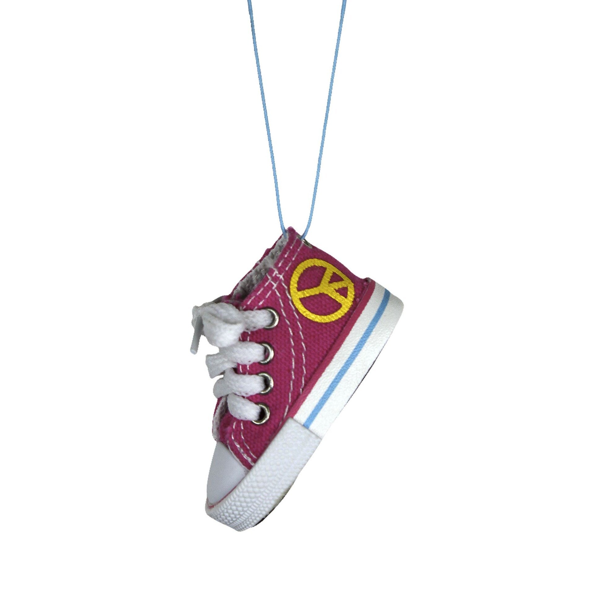 Le désodorisant est en forme d'une chaussure mauve avec le signe Peace & Love en doré à côté du talon.