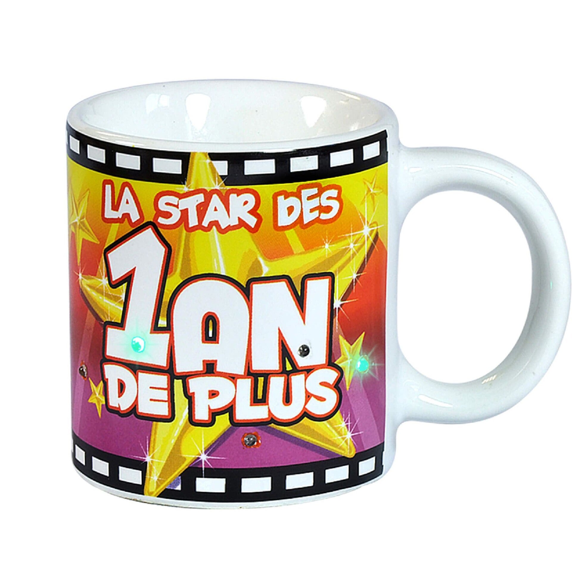 Ce mug lumineux Anniversaire 1 an de + est le cadeau parfait pour célébrer un anniversaire.Soyez sûr de faire plaisir avec ce mug lumineux. Fabriqué en céramique blanche, il possède un design coloré et des diodes qui s'éclairent dès la prise en main.En plus de ces diodes lumineuses on retrouve sur ce mug pour anniversaire la mention : « 1 an de + », entourée d’étoiles.Ce mug lumineux est un cadeau qui permettra à son bénéficiaire de se rappeler ce cette belle journée au moment de boire un café, un thé ou un chocolat chaud. Caractéristiques du mug lumineux Anniversaire 1 an de +Idée cadeau originale Impression recto/verso Matière : céramique Dimensions (poignée incluse) : 11,5 x 9,7 cm Poids : 320 g